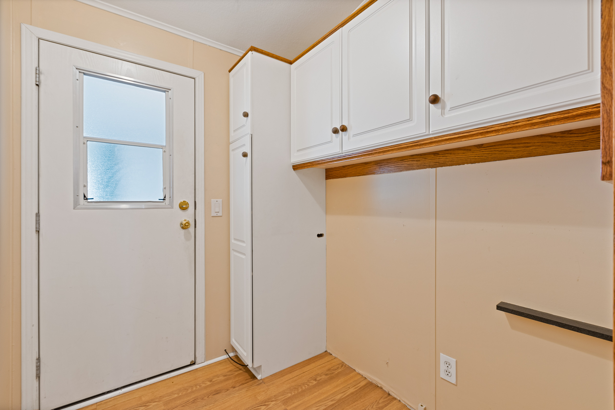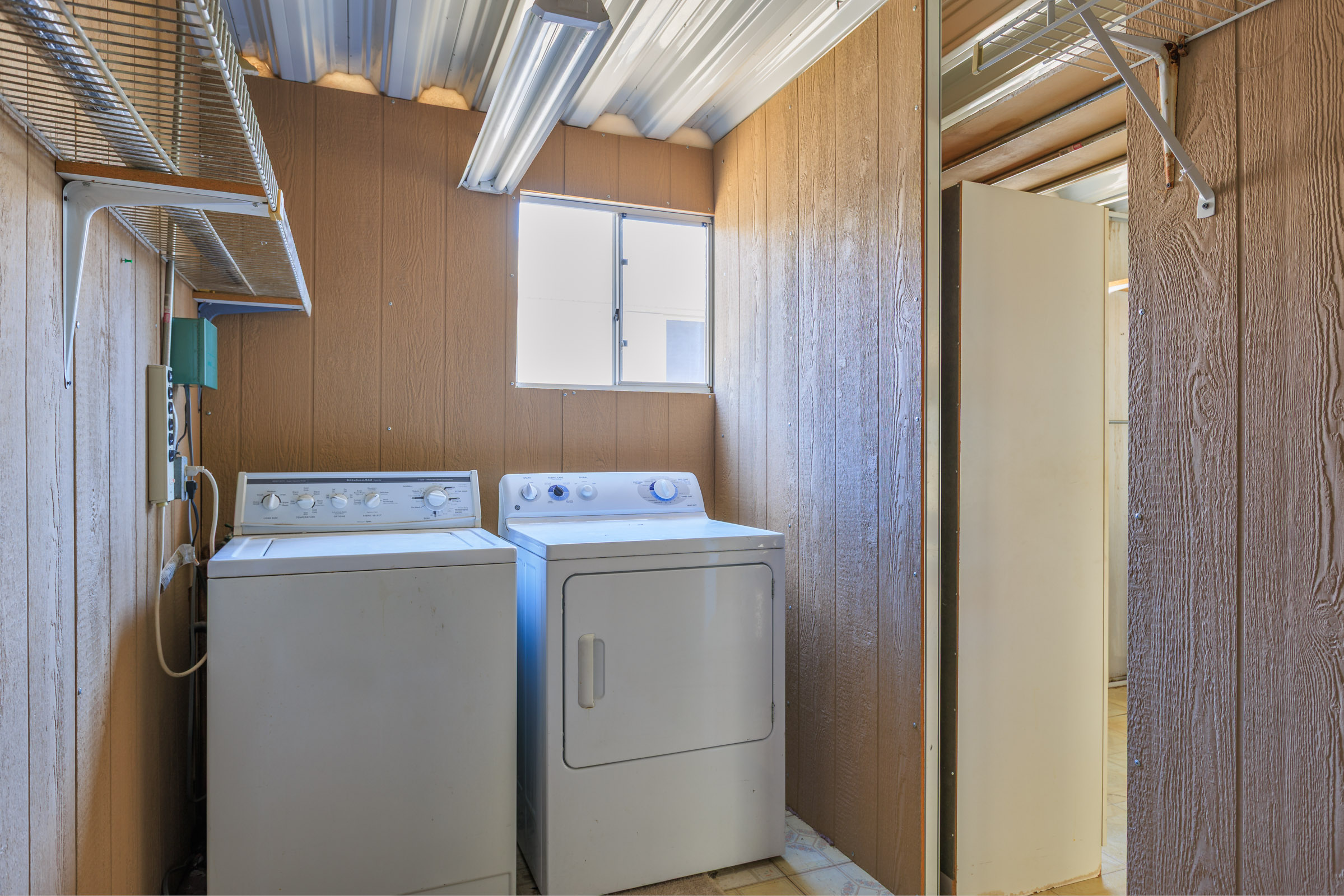 - Washer/dryer area, overhead shelf and built-in desk