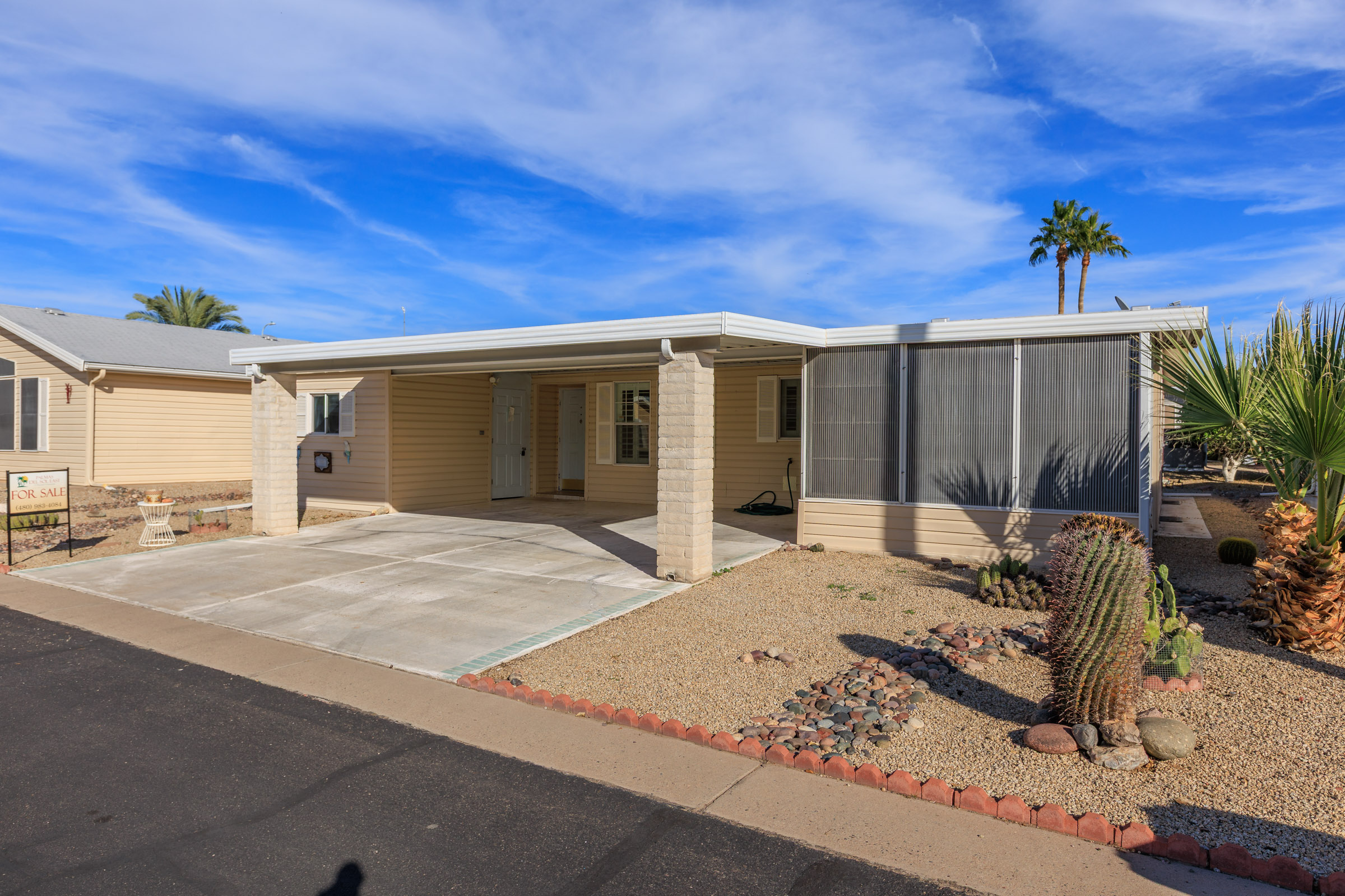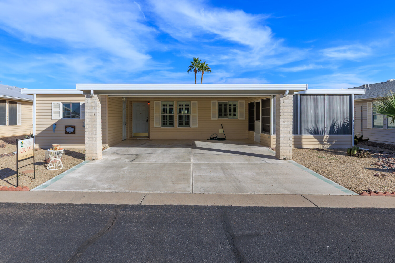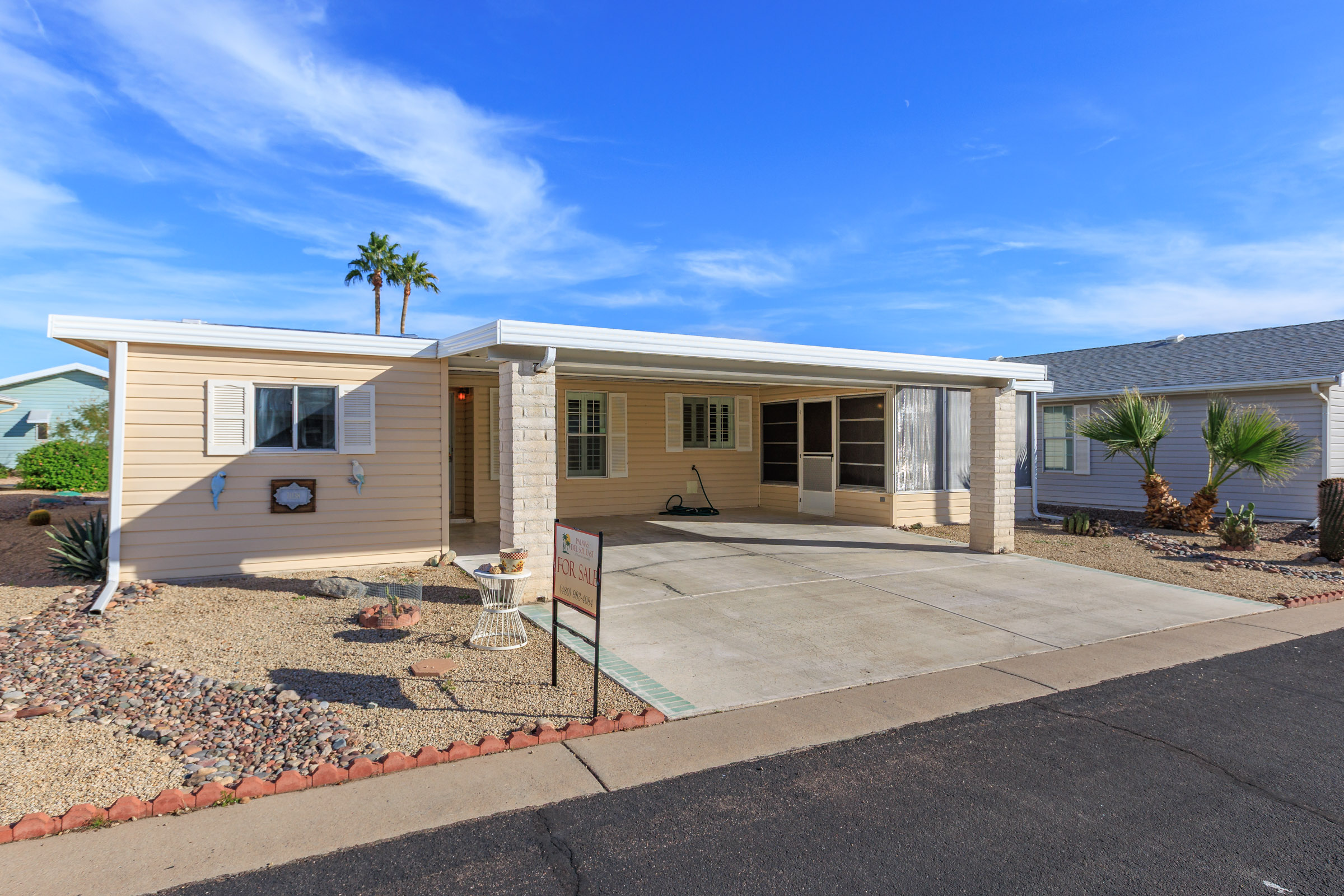 This cozy home has everything you need! New Frigidaire slide in stove/oven. Split floorplan with bedrooms and bathrooms at each end of the home offer privacy for your guests. A nice open floorplan allows you to entertain easily. Side by side parking and an extra large storage shed compliment this home, along with front and back patios for rest and relaxation. Washer and dryer conveniently located just off the kitchen. A little TLC and this will be a really comfortable winter retreat home or perfect for enjoying Arizona year-round!