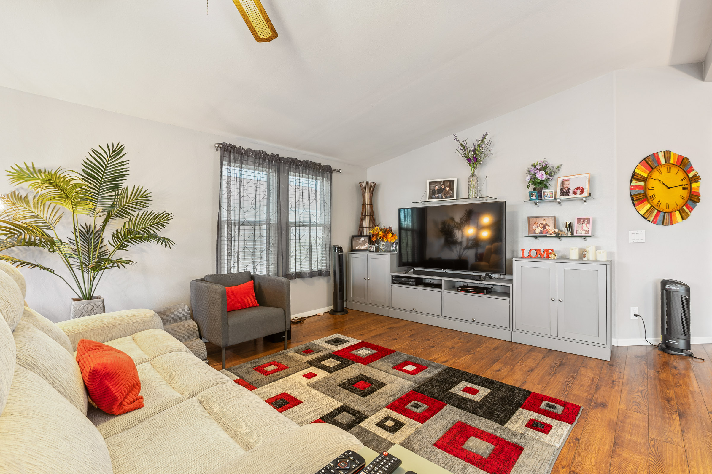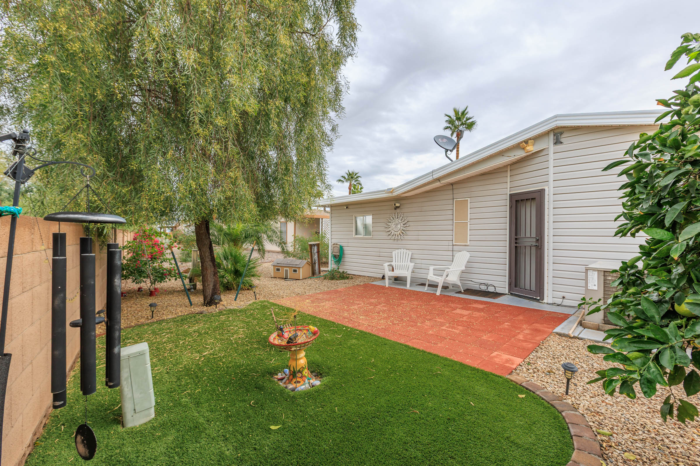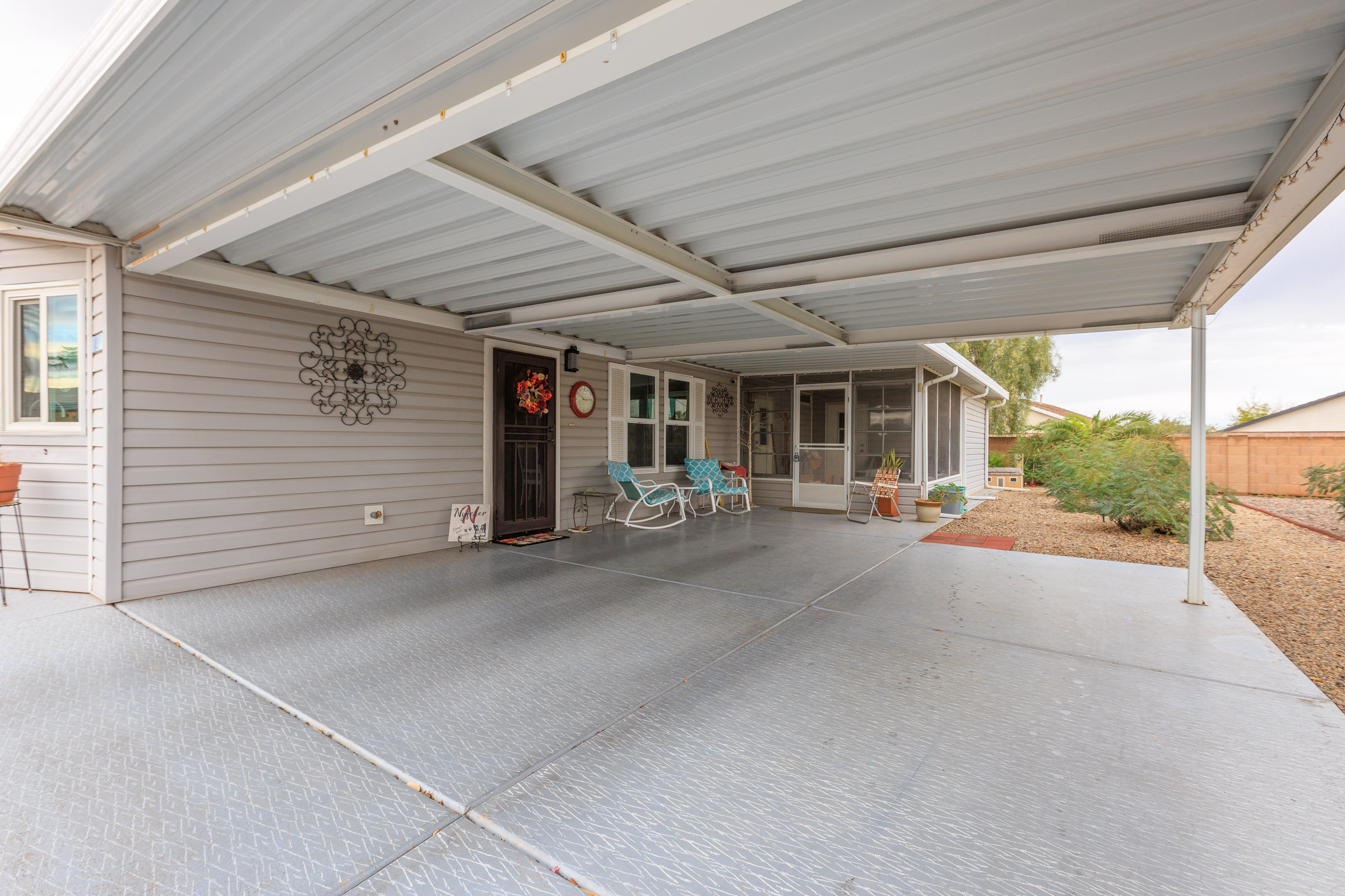 This home has everything you want…Open Floor Plan, with 1456sf, lots of space and large bedrooms. New Windows, New Roof, New Water Heater, and Fully Furnished! Vinyl Plank Flooring. Ikea cabinets in laundry room for extra storage. New Stainless appliances. Extra refrigerator in laundry room. Step-in shower in master bathroom. The AZ Room is screened in for relaxing and enjoying our beautiful weather. Motion lights in front and backyard. Custom made steel security doors on front and back. The side-by-side carport is a real bonus feature! Peaceful, private backyard on perimeter wall. This is a very clean home with upgrades and furnishings for you to start enjoying the Palmas Del Sol East lifestyle!