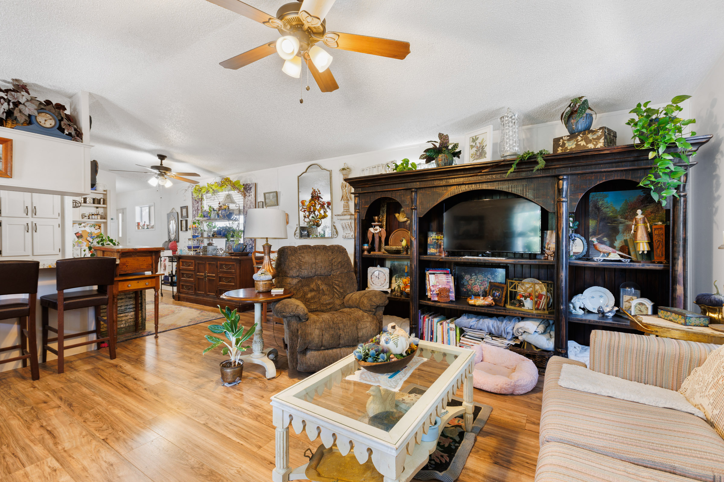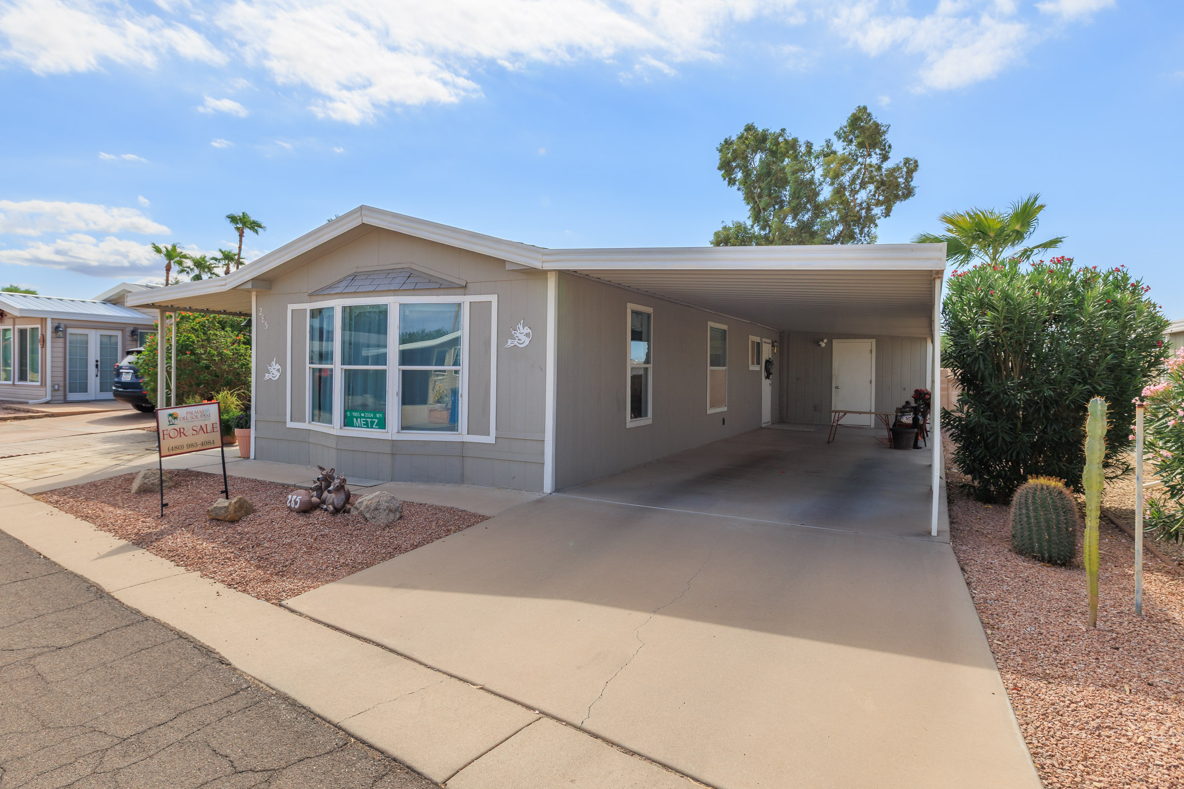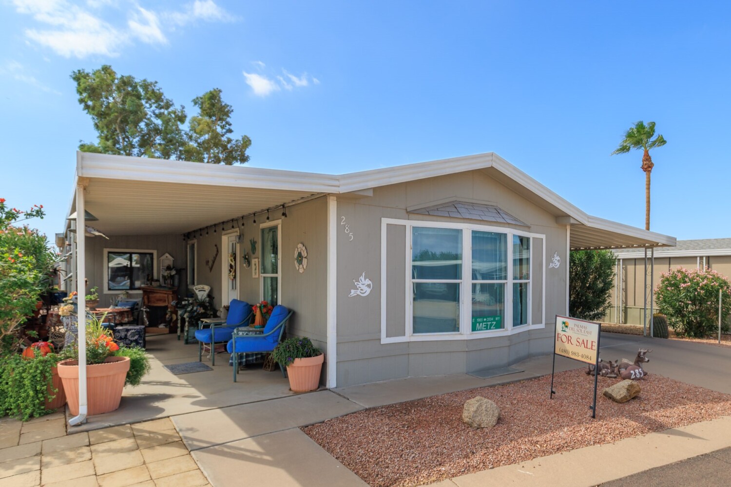 Charming home with covered patio, AZ room, close to clubhouse. north, south exposure. Private backyard backs to perimeter wall. Built-in breakfast bar and menu planning desk. Bay window in the open living room space. Screened in porch with a bonus room off the guestroom. The A/C Unit has been routinely serviced. Most windows have sunscreens. A wonderful home to live in and enjoy the Palmas Del Sol East lifestyle!