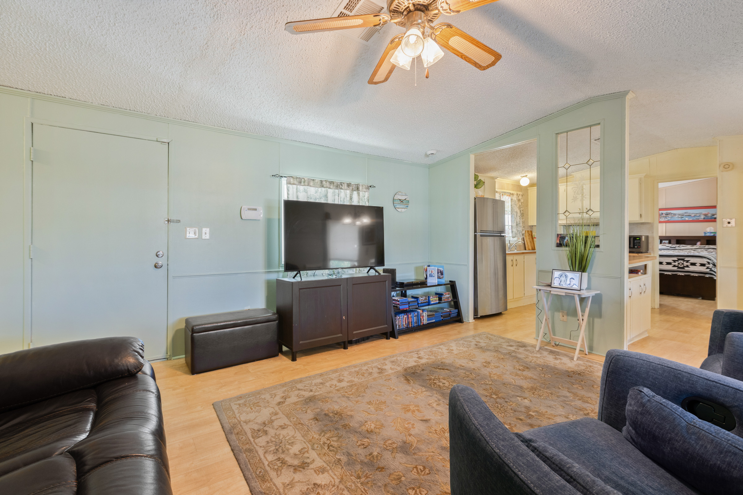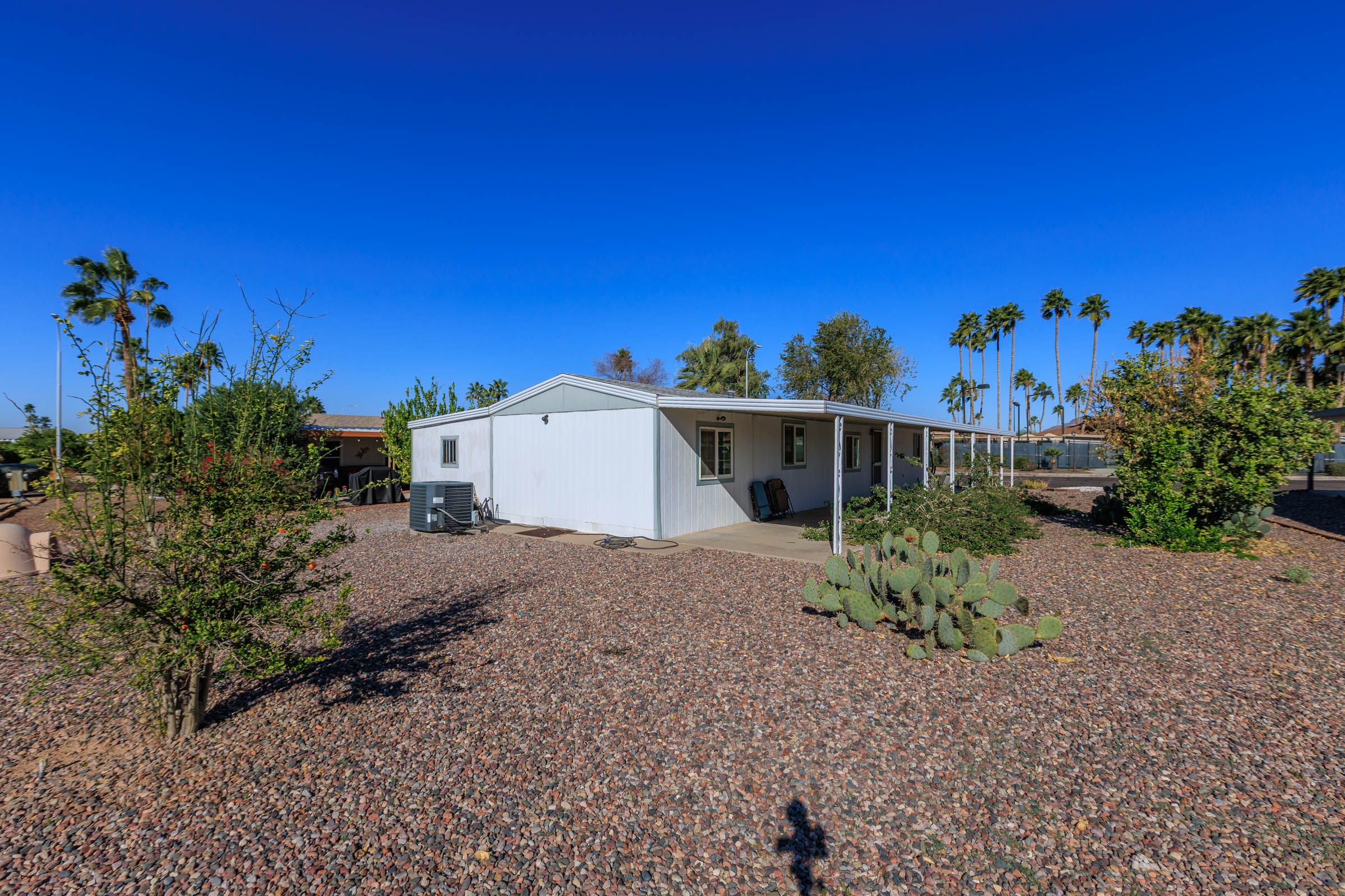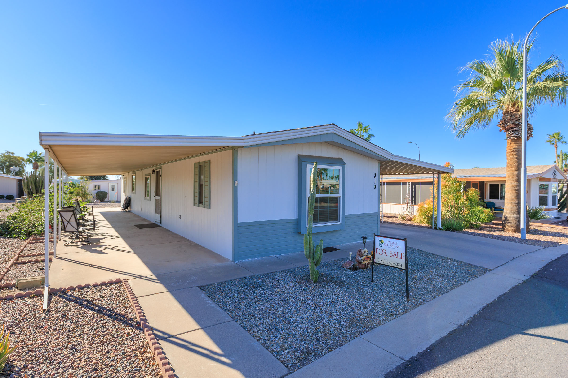 Located directly across from the clubhouse, pool and sport courts as well as the small dog park, this cozy home has everything you need! Split floorplan, 2 bedrooms and bathrooms on each end of the home offer privacy for your guests, while a nice open floorplan allows you to entertain easily. Large covered patio perfect for enjoying the beautiful mountain views. A little TLC and this will be a really comfortable winter retreat home or perfect for enjoying Arizona year-round!