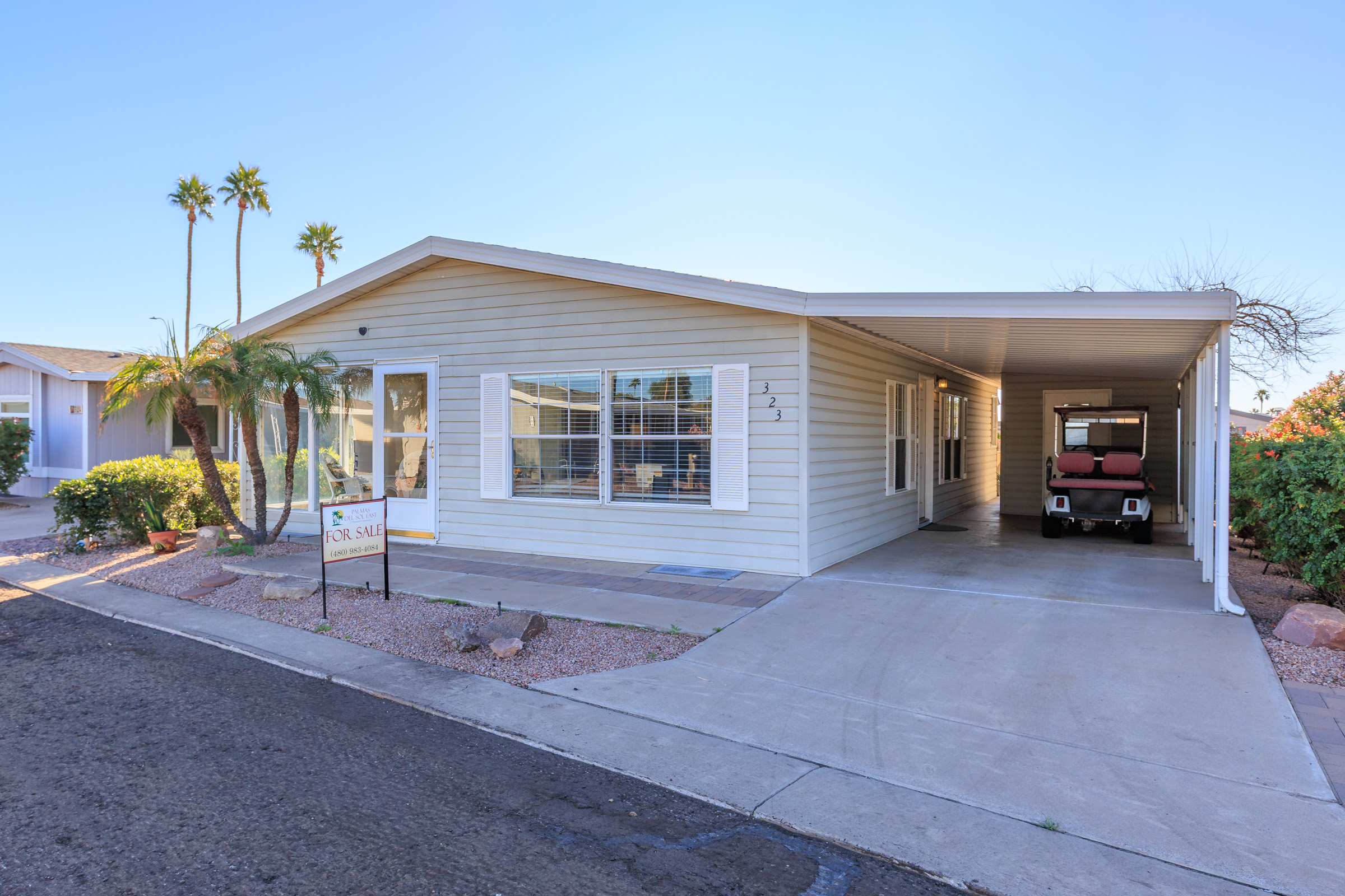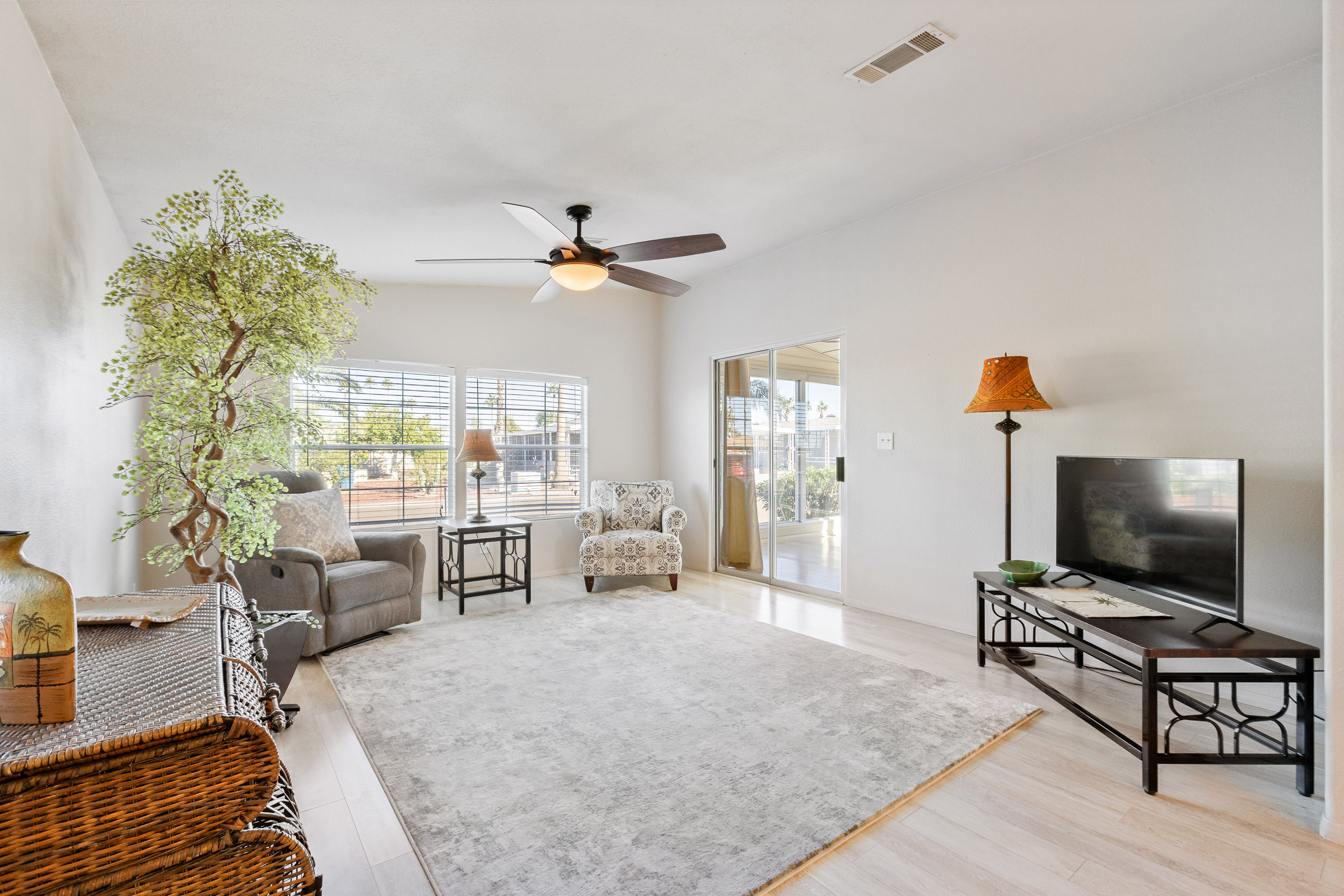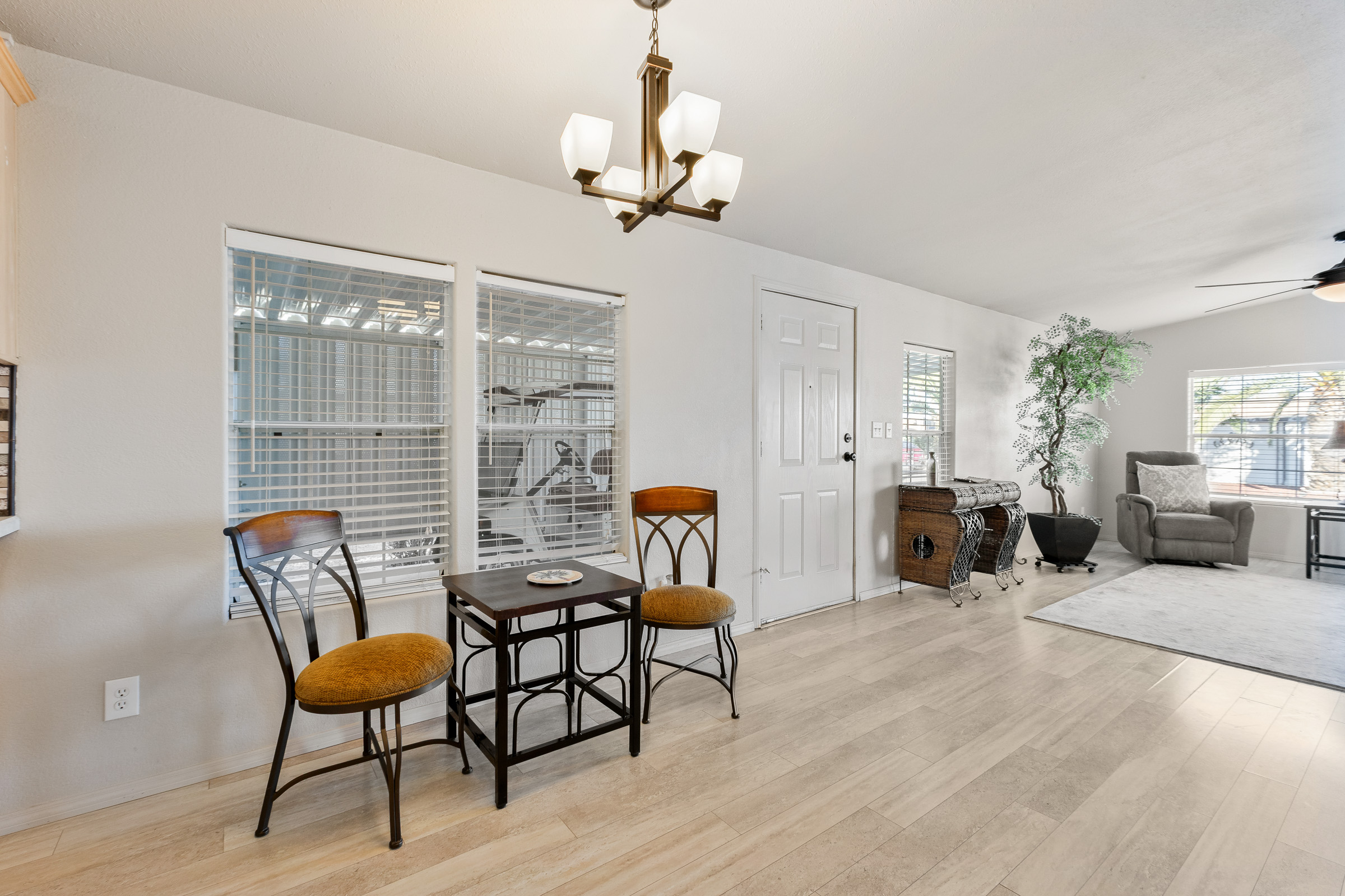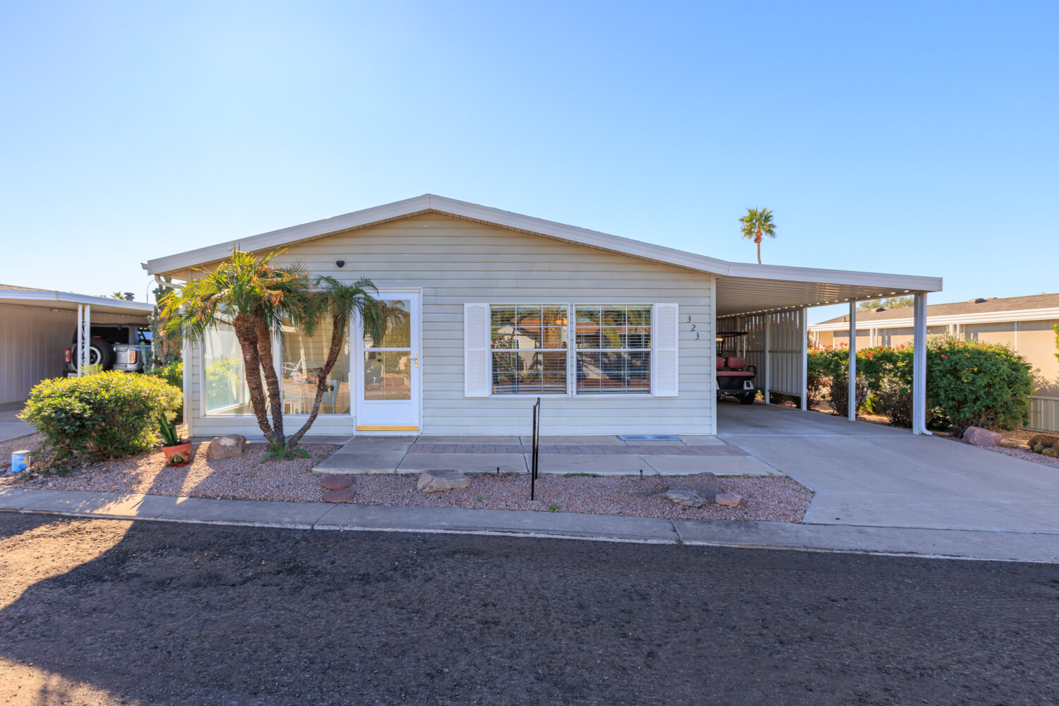 This home features beautiful wood laminate flooring, granite-looking countertops, new AC and water heater. The enclosed AZ Room with windows on the front of the home offers additional living space accessible from the main living room or from the master bedroom. This super cute and cozy home is made for sunset lounging on the front patio with Superstition Mountain views and gorgeous AZ sunsets. The private and spacious backyard patio is the perfect spot for dining under the stars with great friends!