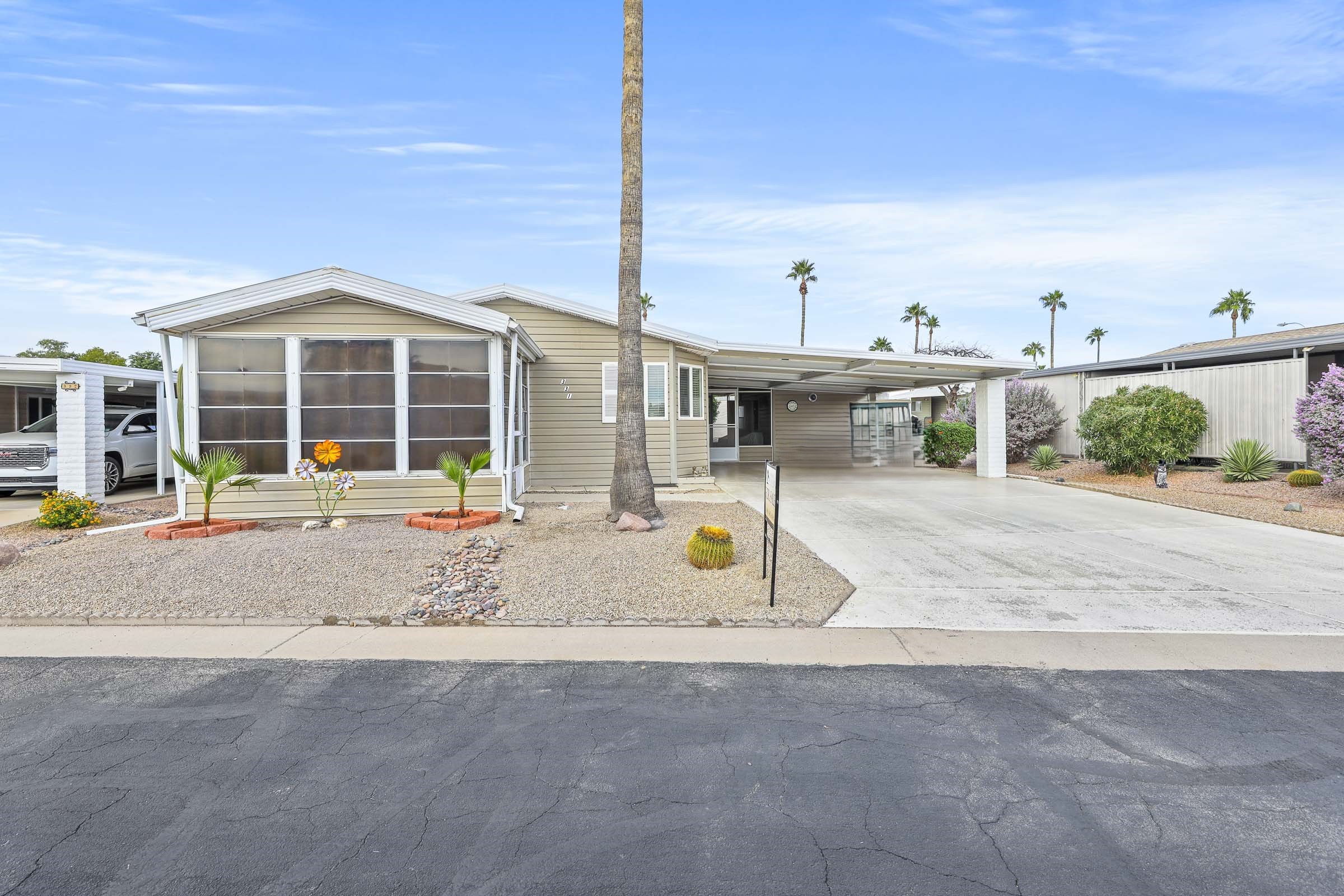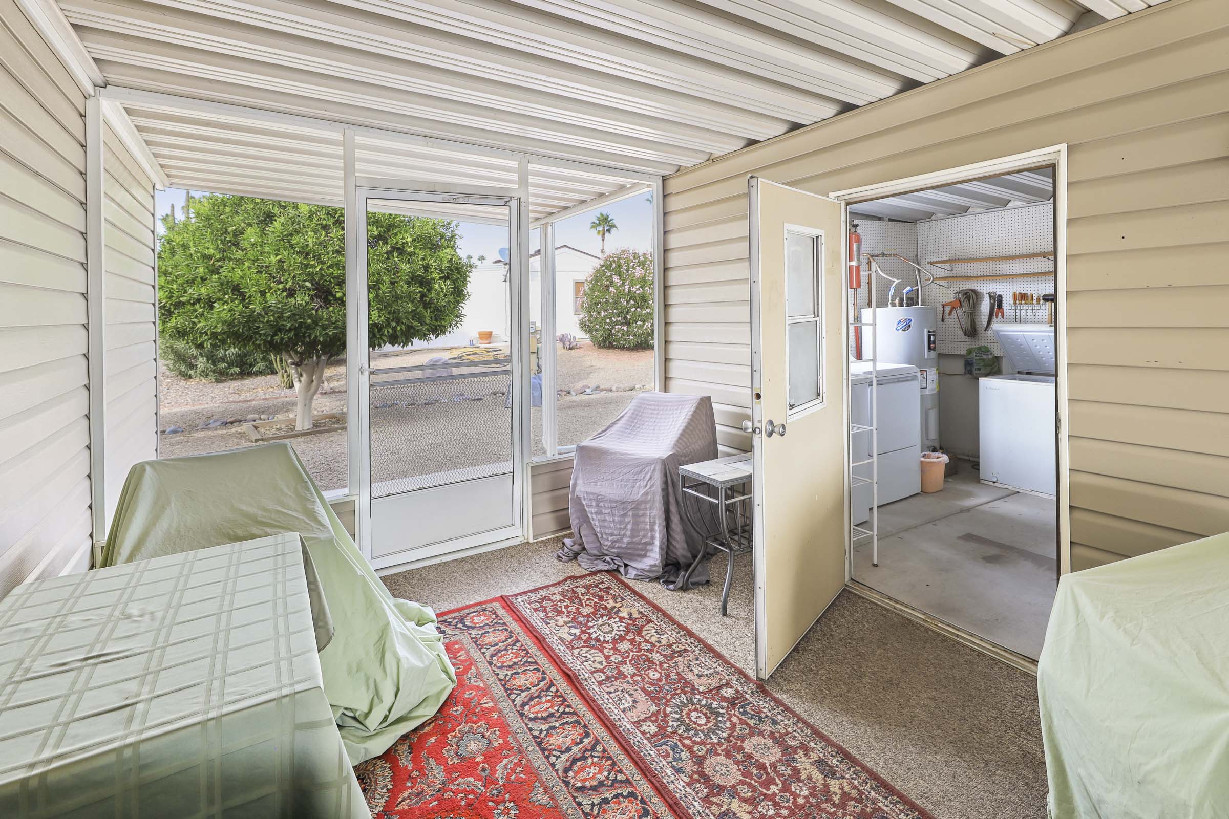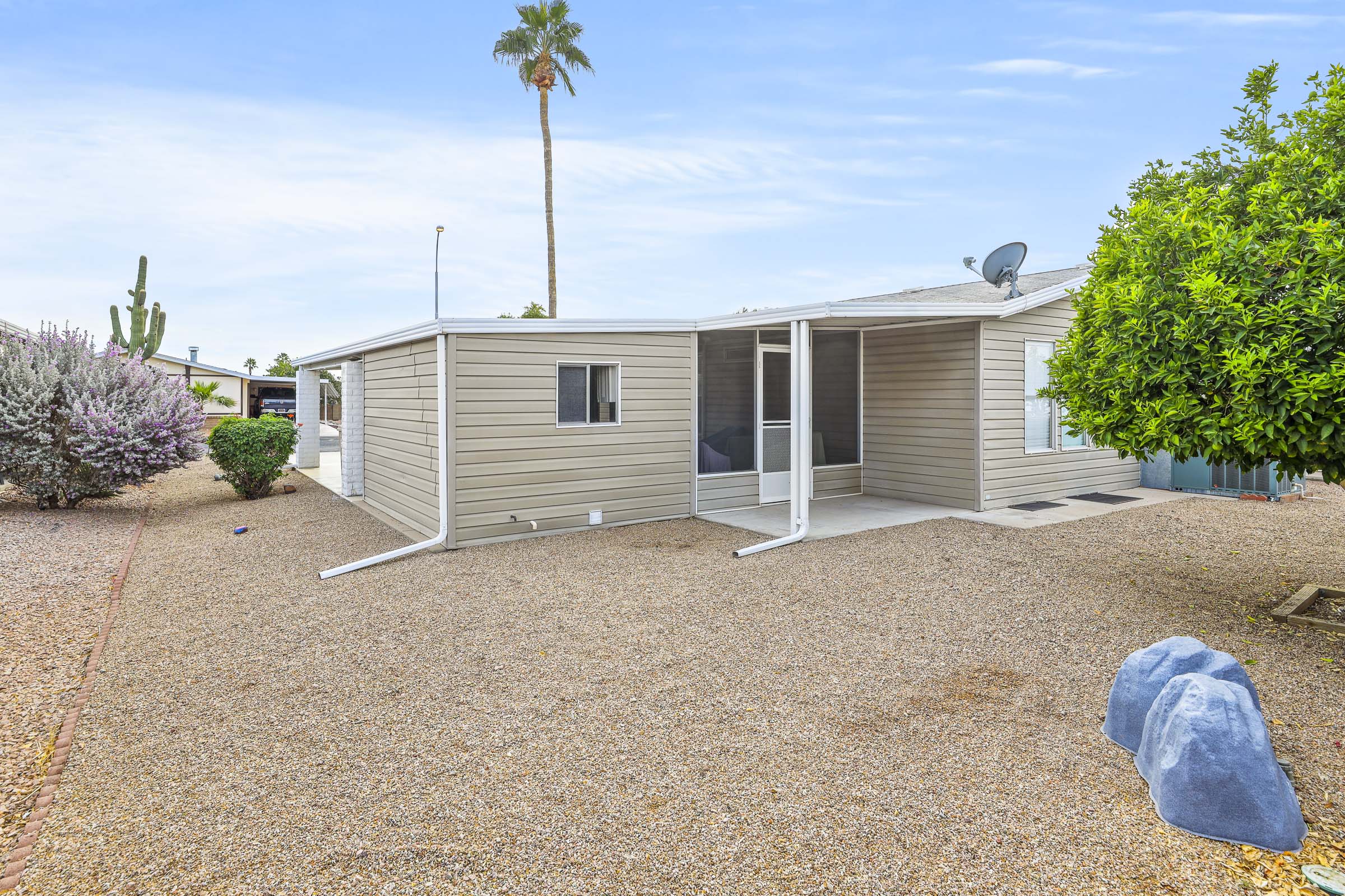 IMMACULATE AND FULLY FURNISHED home with laminate flooring throughout. Having the kitchen on the front of the home provides plenty of of natural sunlight. Breakfast bar and spacious living room make this a comfortable home for every day living and enjoying time with friends and family. The leather sofa in the family room is a hide-a-bed. Master bedroom bath features double sinks and a step in shower New AC Unit in 2025; water heater in 2023; newer roof. GE Washer and Dryer. Two AZ Rooms, one on the front of the home and one on the back of the home add additional living space. Textured ceilings throughout. Freshly painted interior walls throughout the home. New ceiling fans in all rooms. Motion lights on exterior for added security. FANTASTIC, SPACIOUS BACKYARD WITH GORGEOUS MOUNTIAN VIEW! ENJOY FRESH PICKED CITRUS FROM THE 2 CITRUS TREES!!! Close to the back gate. DOUBLE SIDE-BY-SIDE CARPORT IS A REAL BONUS AND PROVIDES LOTS OF PARKING SPACE. This is a FABULOUS HOME! GRAB IT BEFORE IT’S GONE!!!