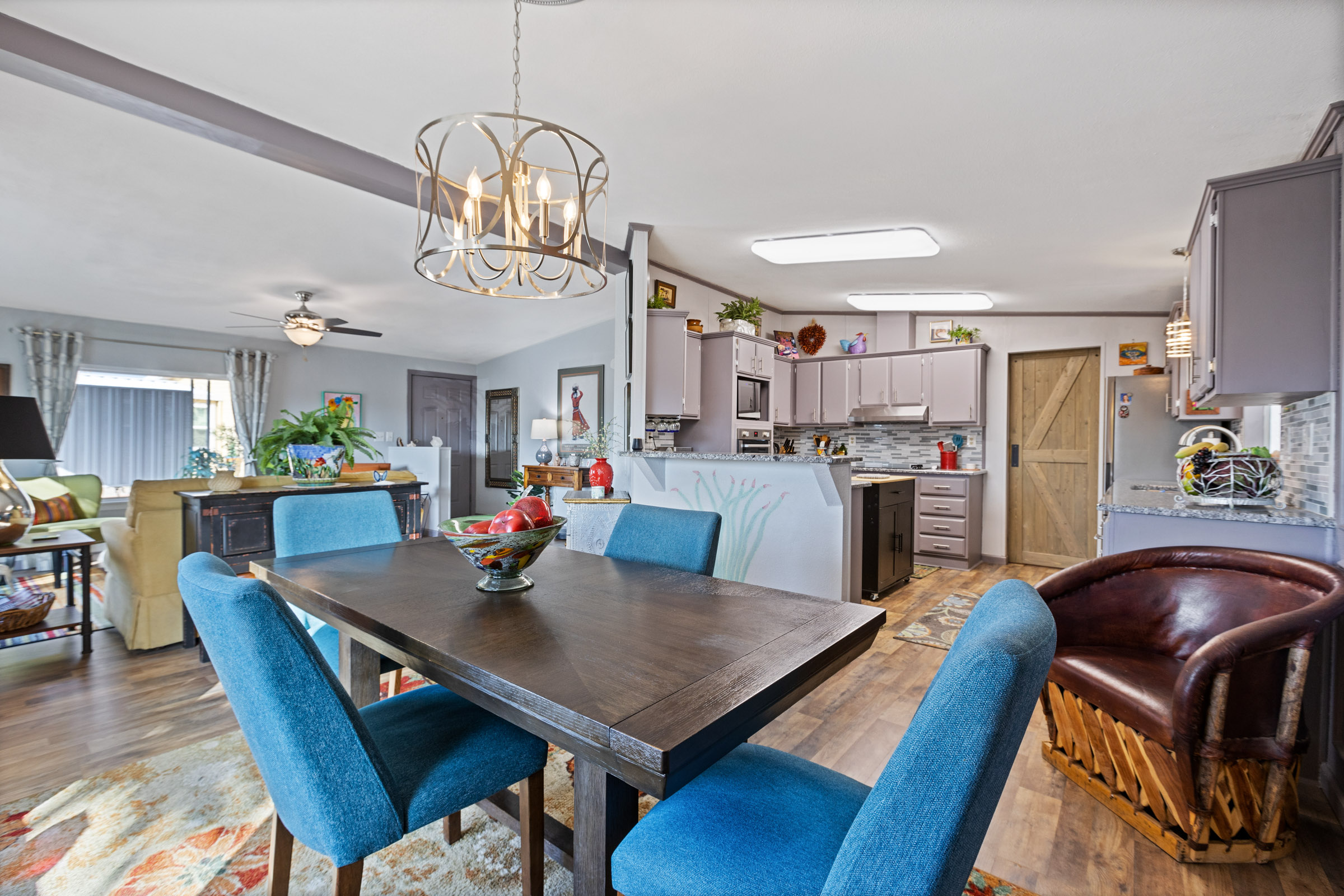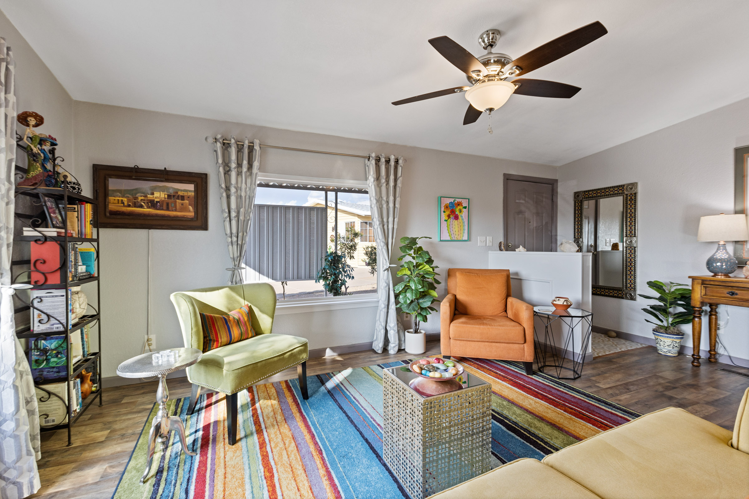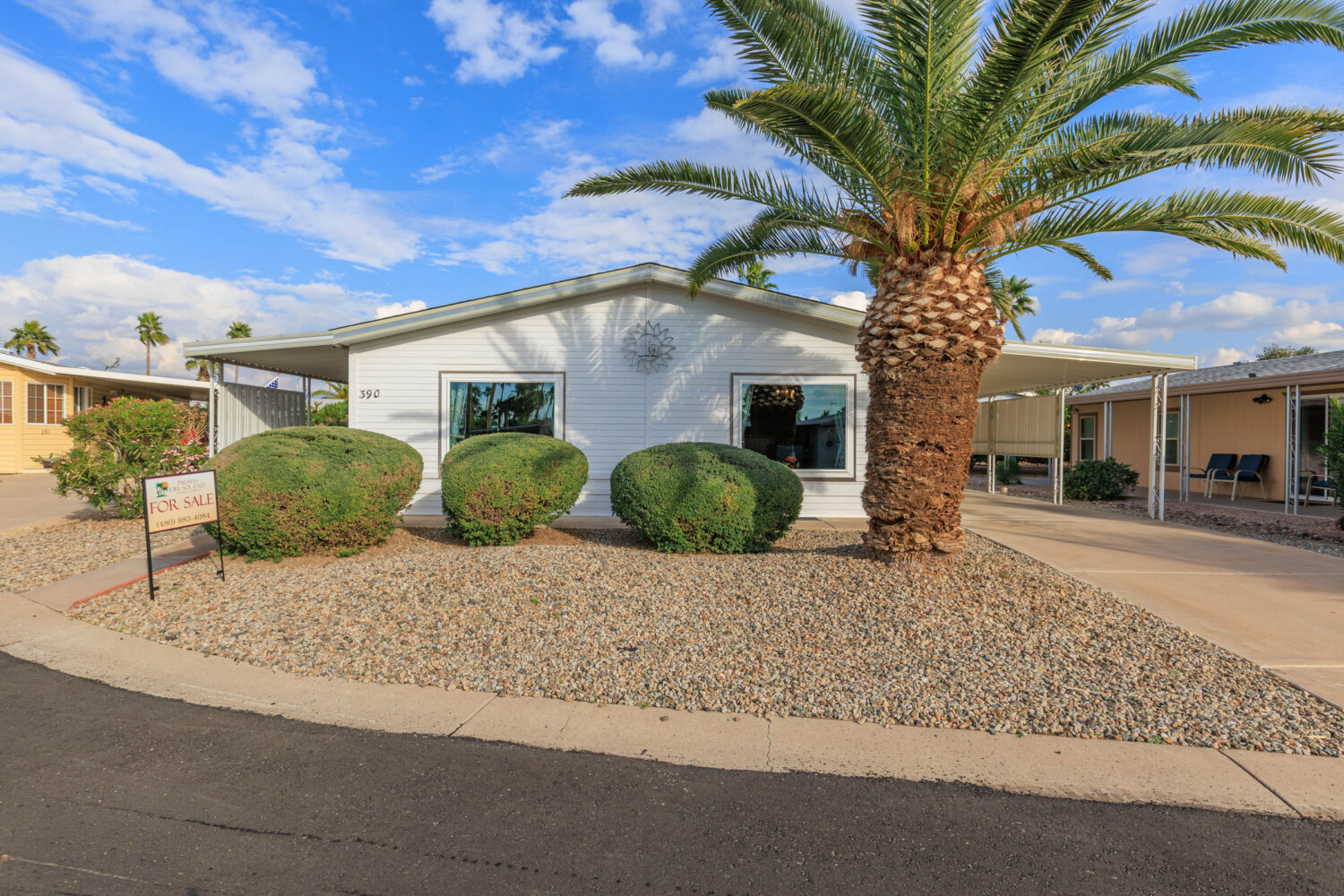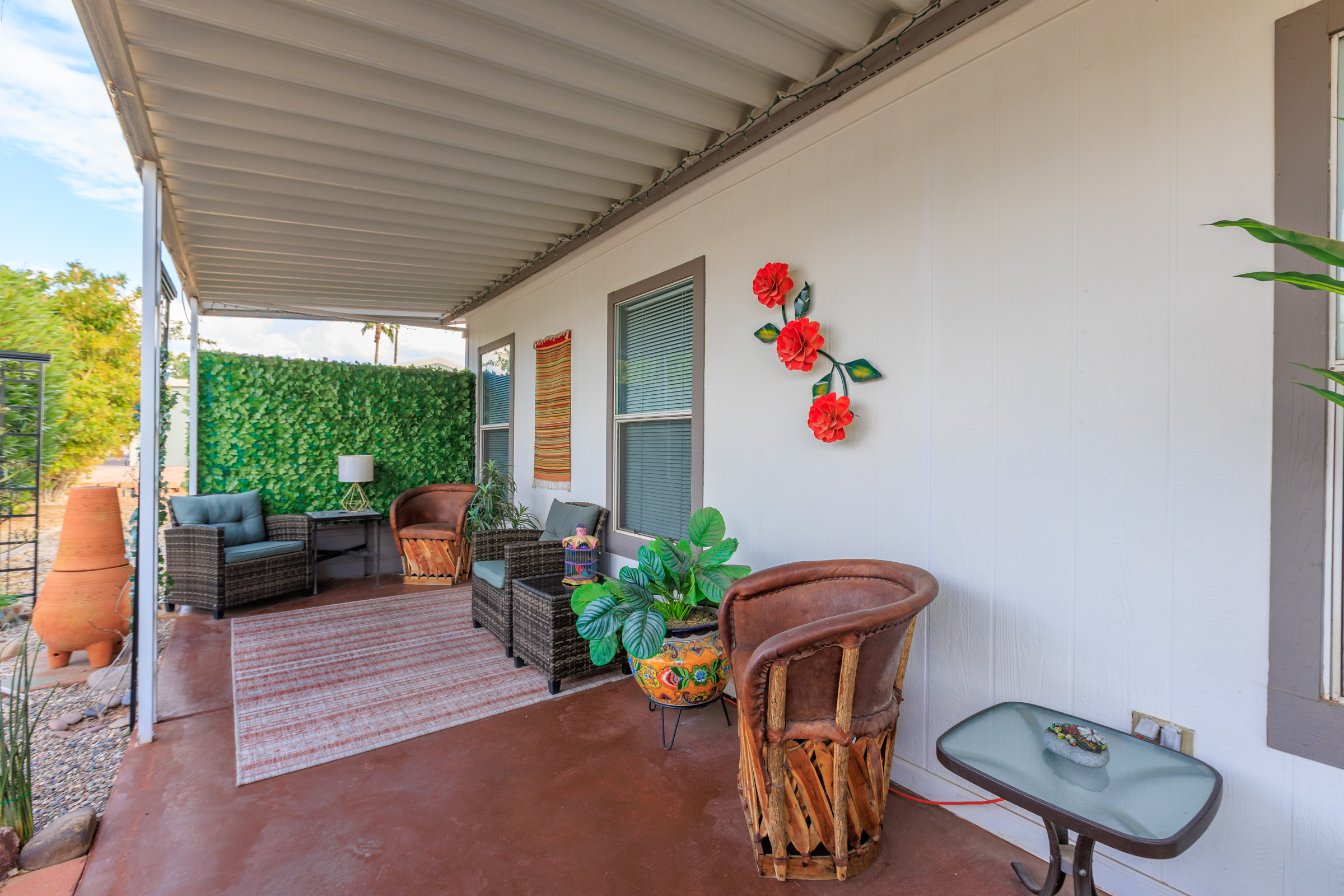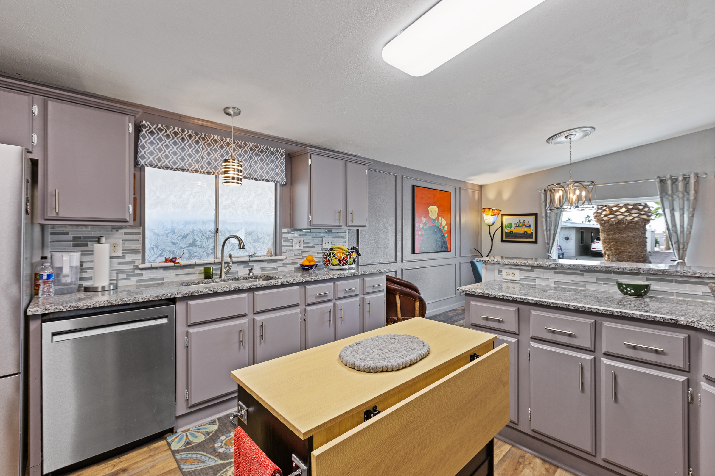 This beautiful home is located in a quiet cul-de-sac and features two large picture windows with glazed dual pane glass that fill the home with natural light. Includes all window treatments. New laminate flooring throughout. New ceiling fans in all rooms. The home is exceptionally clean and well maintained! A sliding barn door in the kitchen separates the spacious laundry room which is conveniently located just off the carport entry and includes a new LG washer and LG dryer. Newly painted kitchen cabinets. Granite kitchen countertops, counter depth stainless GE refrigerator, GE electric cooktop, Bosch built-in convection oven and ample kitchen counterspace. Enjoy relaxing on the outdoor patio that runs the entire length of the home. New water heater (2024). Newer roof. Spacious storage shed.