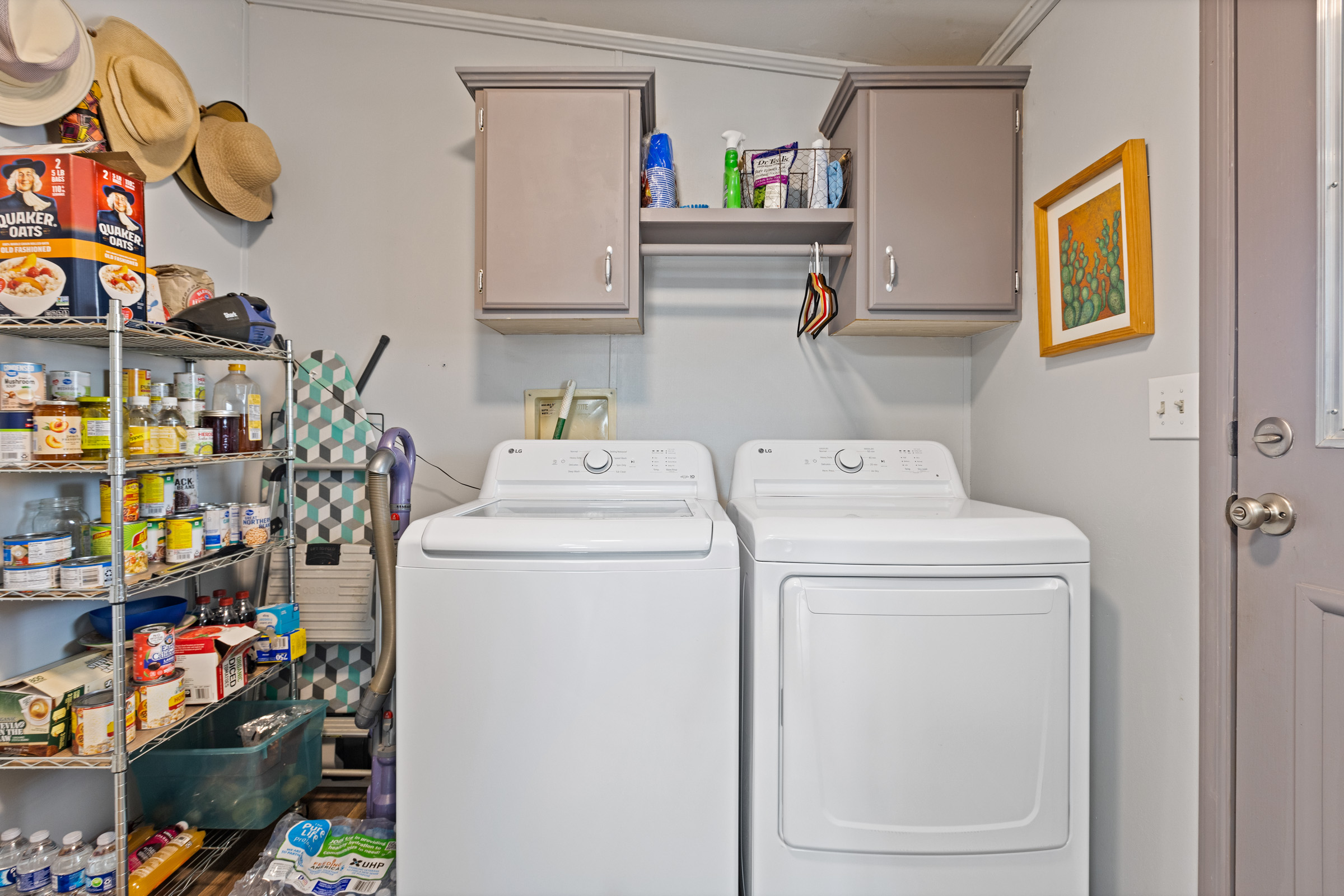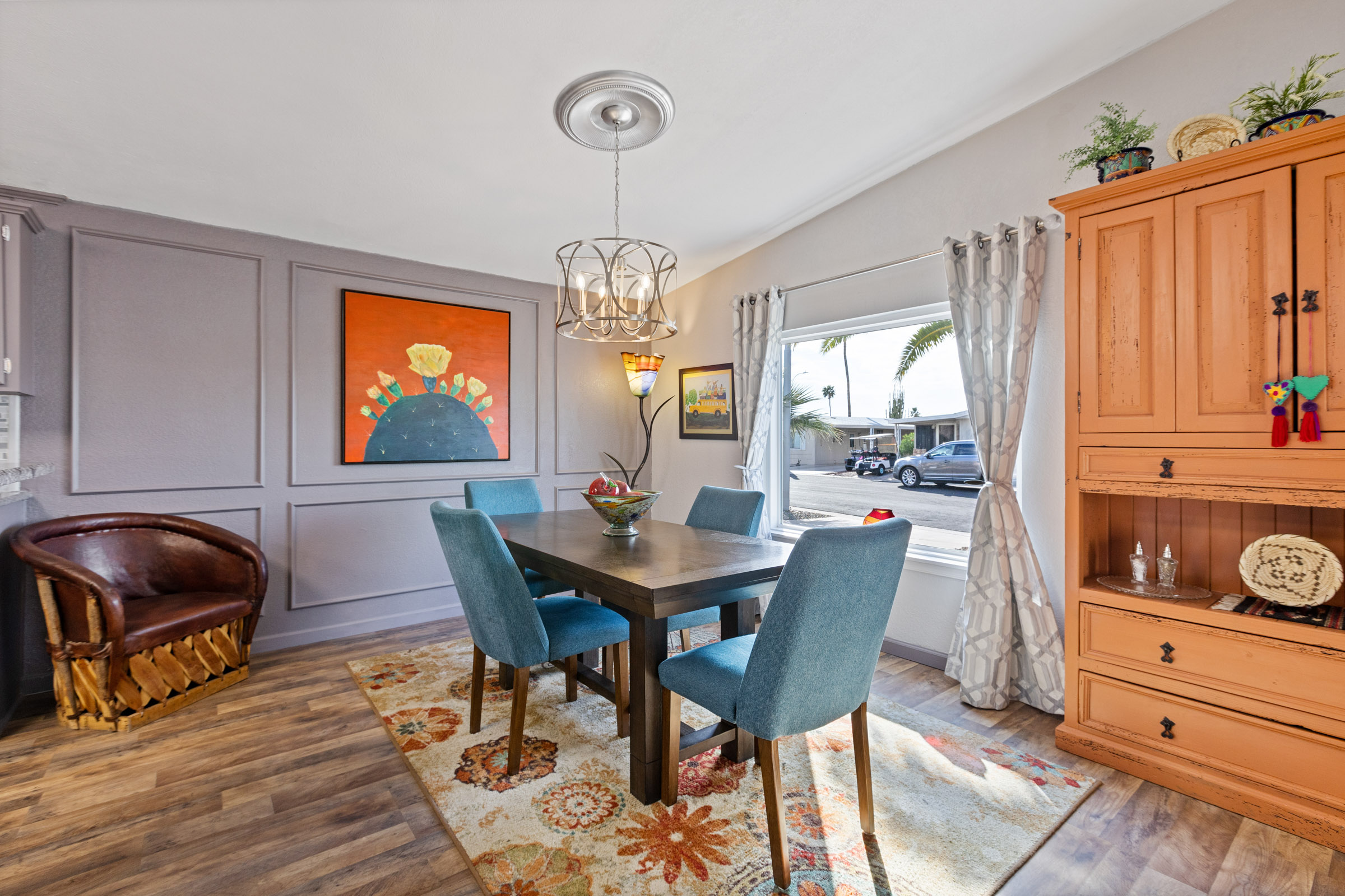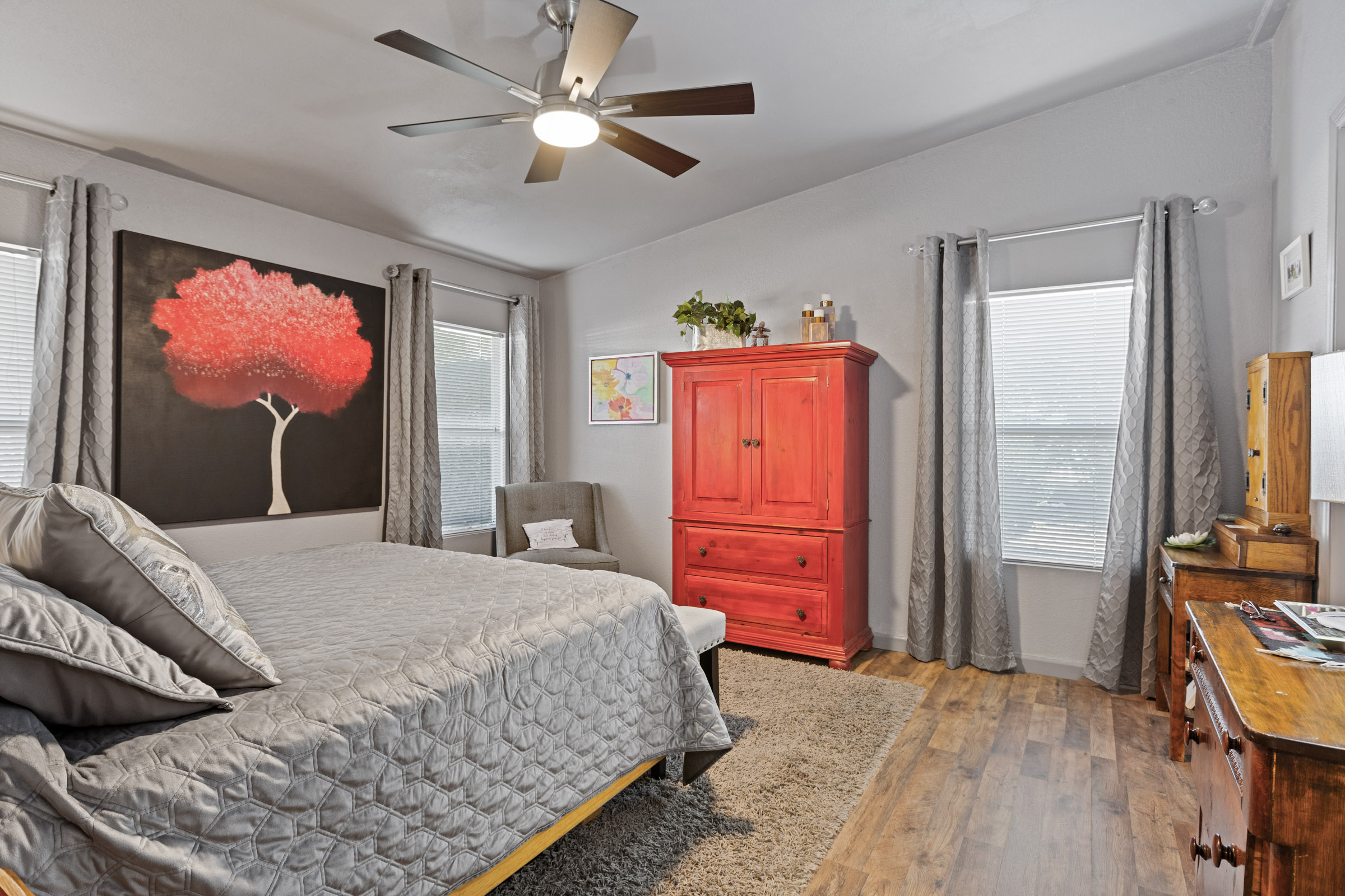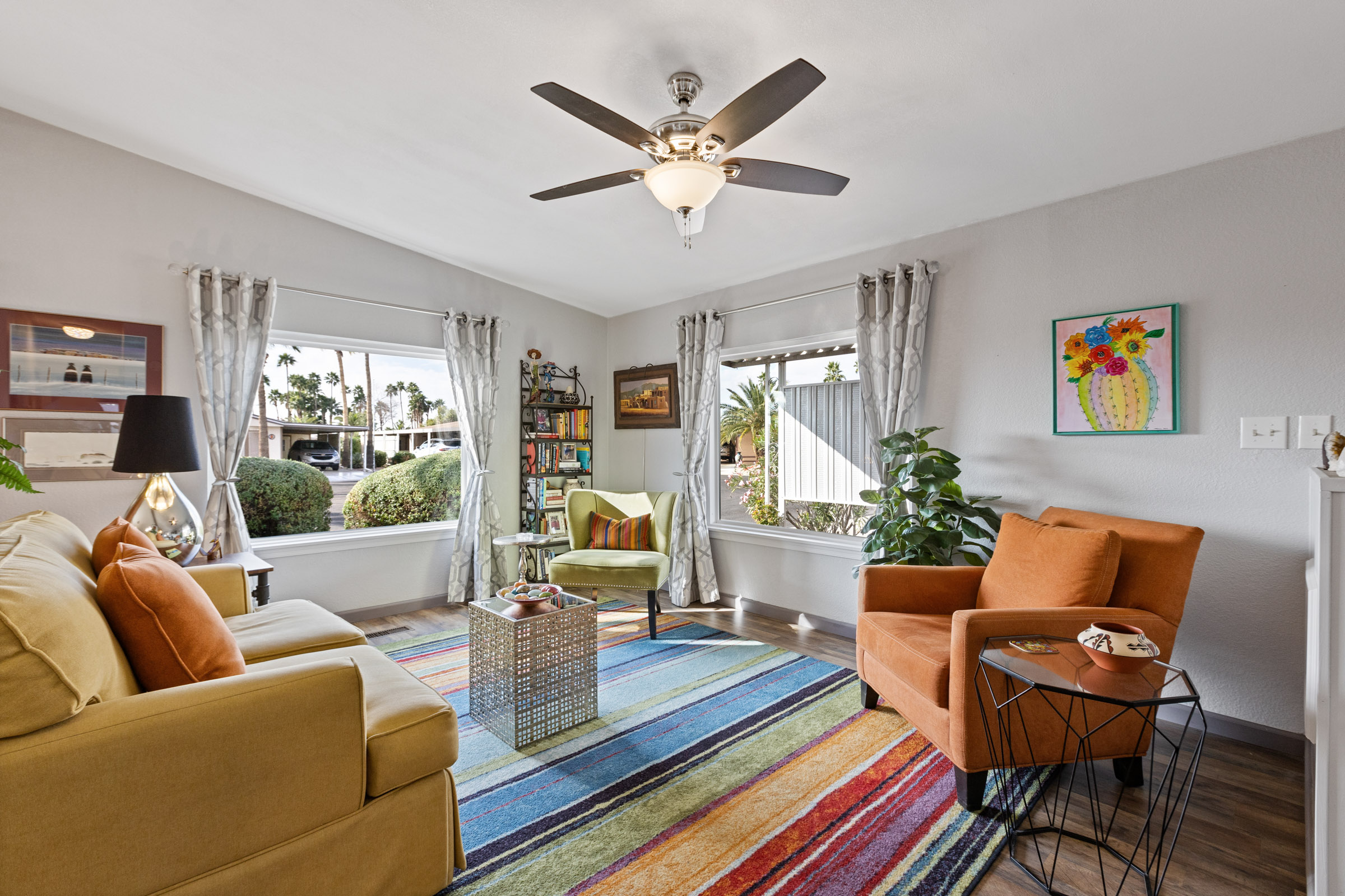 This beautiful home is located in a quiet cul-de-sac and features two large picture windows with glazed dual pane glass that fill the home with natural light. Includes all window treatments. New laminate flooring throughout. New ceiling fans in all rooms. The home is exceptionally clean and well maintained! A sliding barn door in the kitchen separates the spacious laundry room which is conveniently located just off the carport entry and includes a new LG washer and LG dryer. Newly painted kitchen cabinets. Granite kitchen countertops, counter depth stainless GE refrigerator, GE electric cooktop, Bosch built-in convection oven and ample kitchen counterspace. Enjoy relaxing on the outdoor patio that runs the entire length of the home. New water heater (2024). Newer roof. Spacious storage shed.