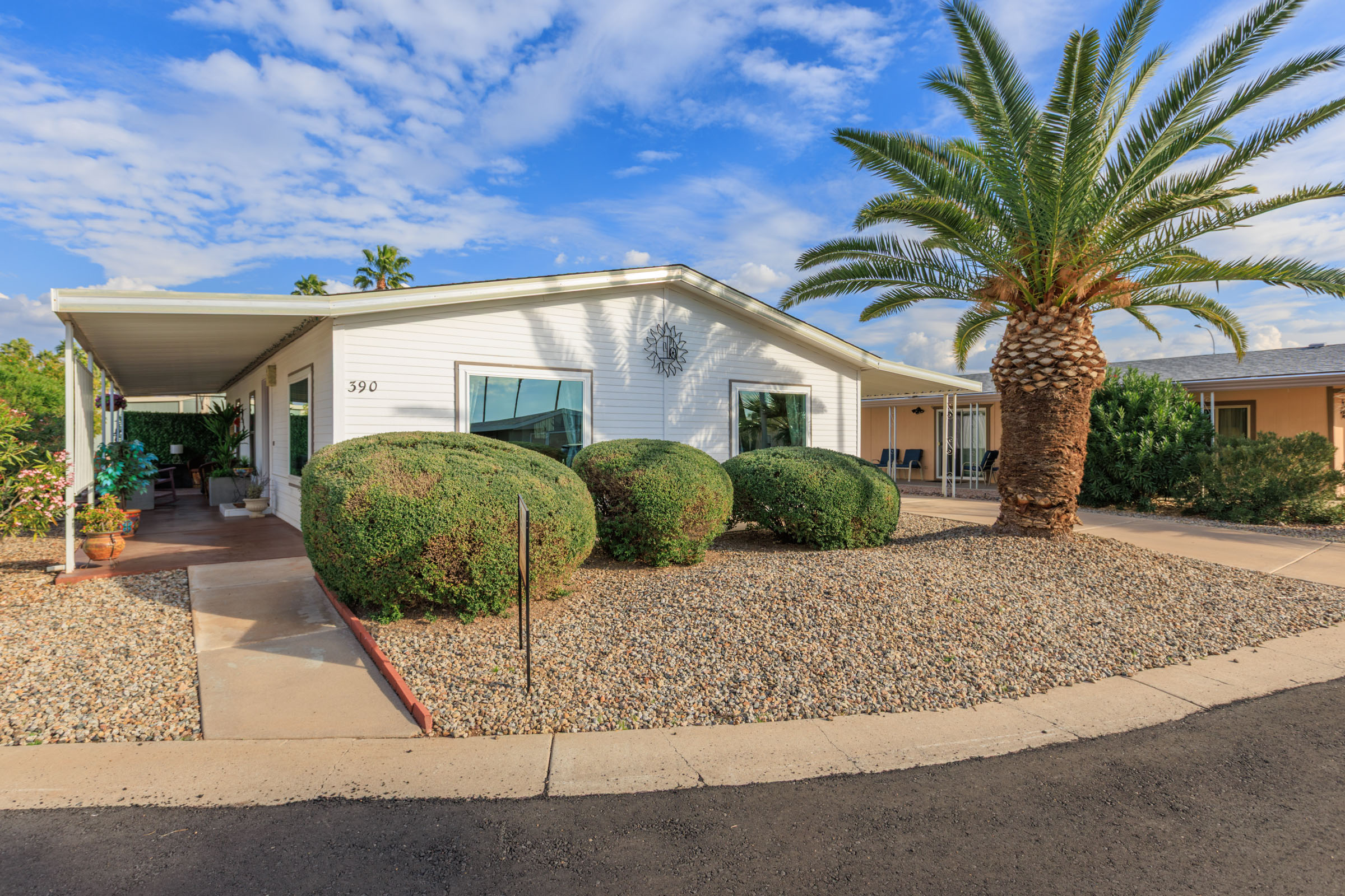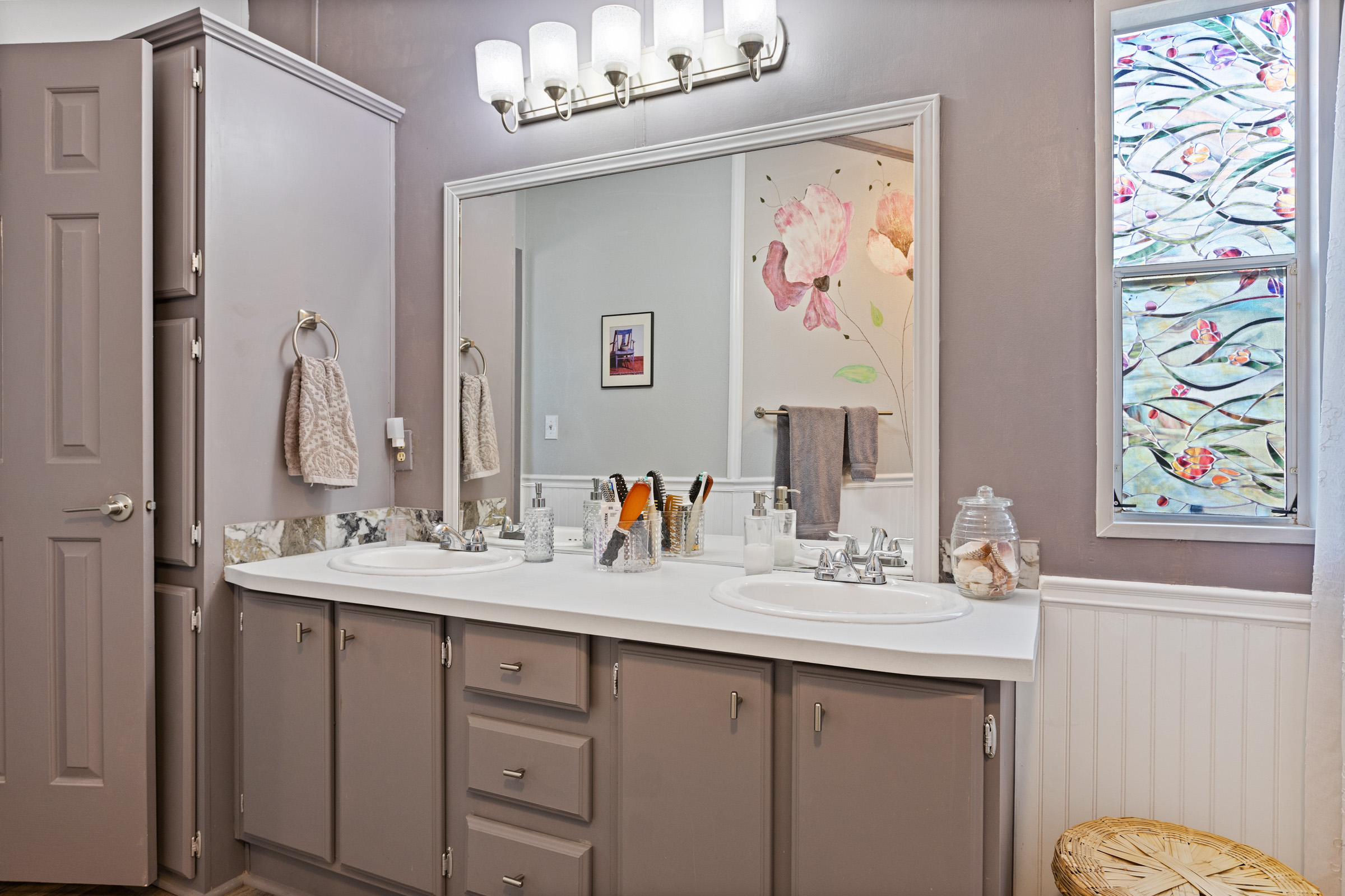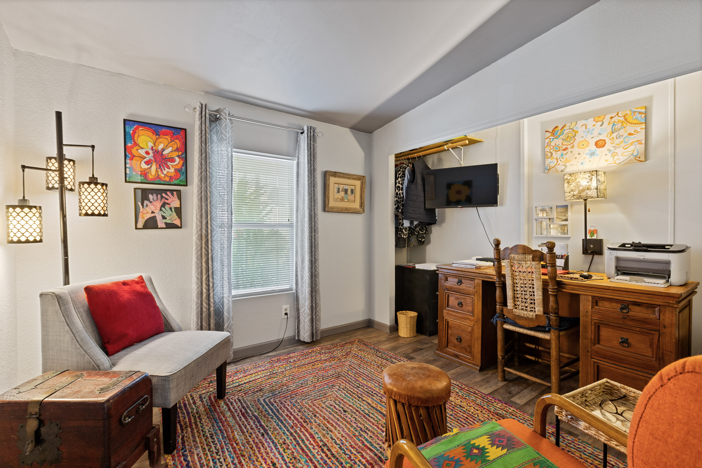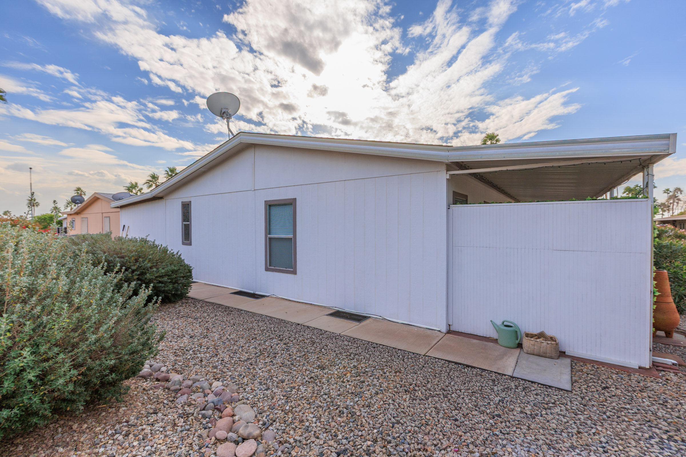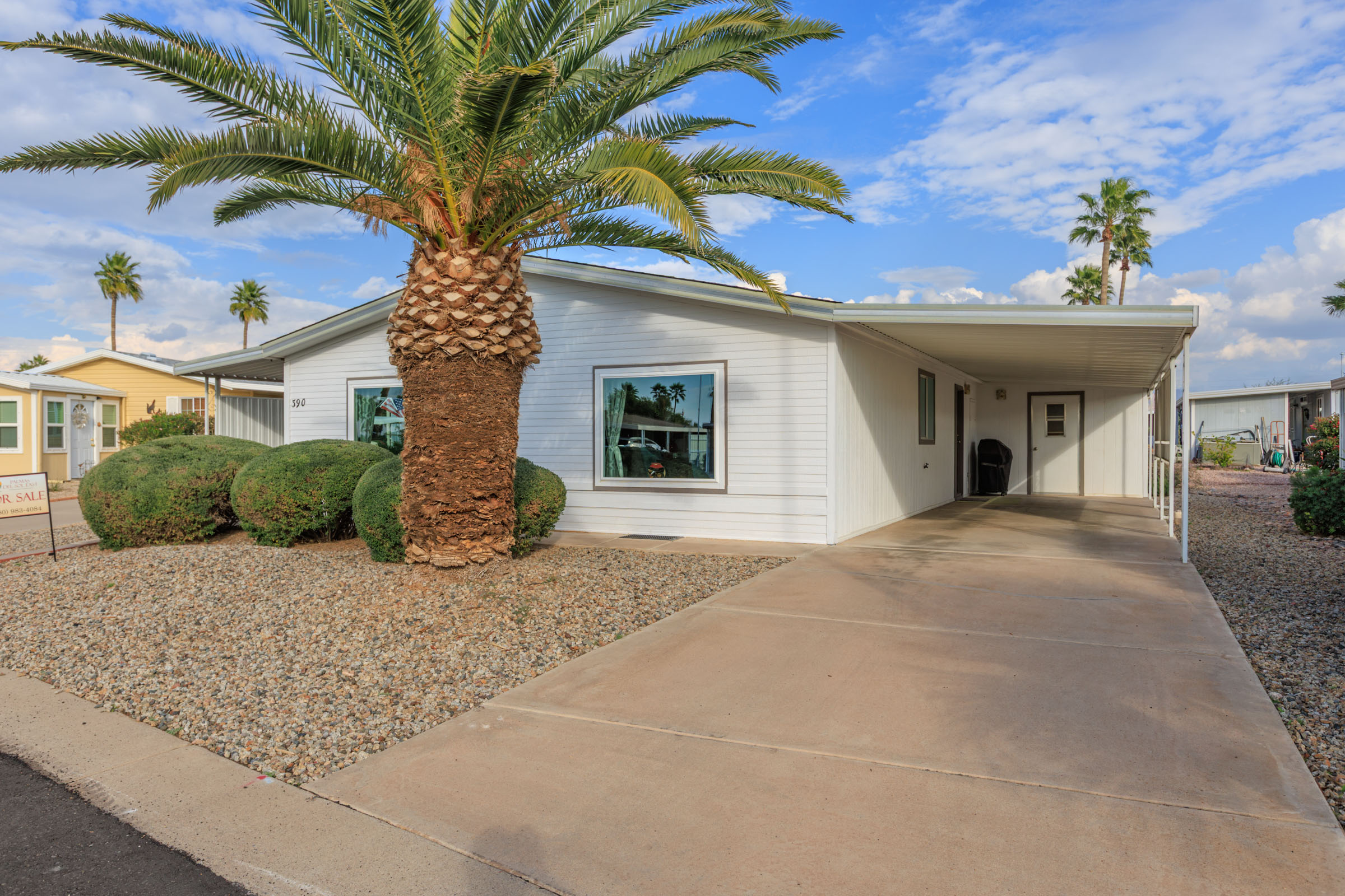 This beautiful home is located in a quiet cul-de-sac and features two large picture windows with glazed dual pane glass that fill the home with natural light. Includes all window treatments. New laminate flooring throughout. New ceiling fans in all rooms. The home is exceptionally clean and well maintained! A sliding barn door in the kitchen separates the spacious laundry room which is conveniently located just off the carport entry and includes a new LG washer and LG dryer. Newly painted kitchen cabinets. Granite kitchen countertops, counter depth stainless GE refrigerator, GE electric cooktop, Bosch built-in convection oven and ample kitchen counterspace. Enjoy relaxing on the outdoor patio that runs the entire length of the home. New water heater (2024). Newer roof. Spacious storage shed.